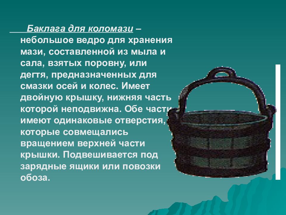 Баклага для коломази – небольшое ведро для хранения мази, составленной из мыла и сала, взятых поровну, или дегтя, предназначенных для смазки осей и колес. Имеет двойную крышку, нижняя часть которой неподвижна. Обе части имеют одинаковые отверстия, которые совмещались вращением верхней части крышки. Подвешивается под зарядные ящики или повозки обоза.