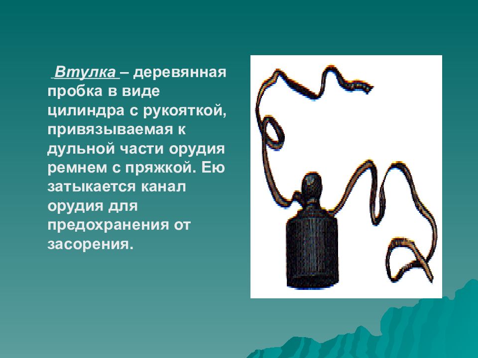 Втулка – деревянная пробка в виде цилиндра с рукояткой, привязываемая к дульной части орудия ремнем с пряжкой. Ею затыкается канал орудия для предохранения от засорения.