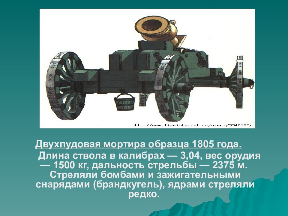 Двухпудовая мортира образца 1805 года. Длина ствола в калибрах — 3,04, вес орудия — 1500 кг, дальность стрельбы — 2375 м. Стреляли бомбами и зажигательными снарядами ( брандкугель ), ядрами стреляли редко.