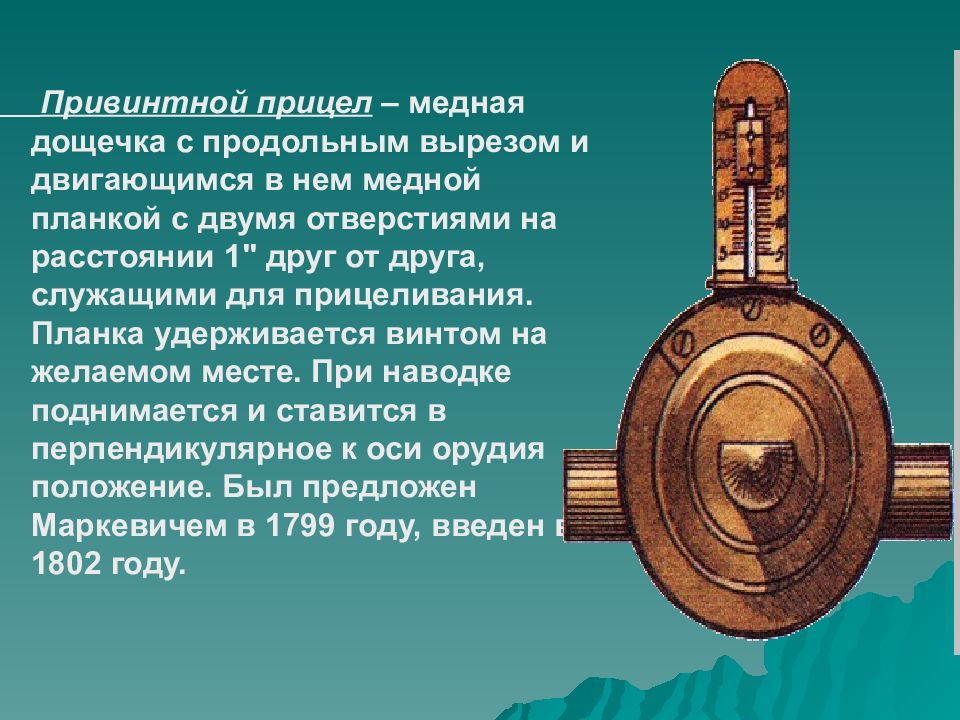Привинтной прицел – медная дощечка с продольным вырезом и двигающимся в нем медной планкой с двумя отверстиями на расстоянии 1" друг от друга, служащими для прицеливания. Планка удерживается винтом на желаемом месте. При наводке поднимается и ставится в перпендикулярное к оси орудия положение. Был предложен Маркевичем в 1799 году, введен в 1802 году.