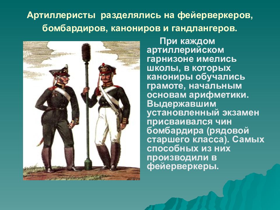 Слайд 5: Артиллеристы разделялись на фейерверкеров, бомбардиров, канониров и гандлангеров