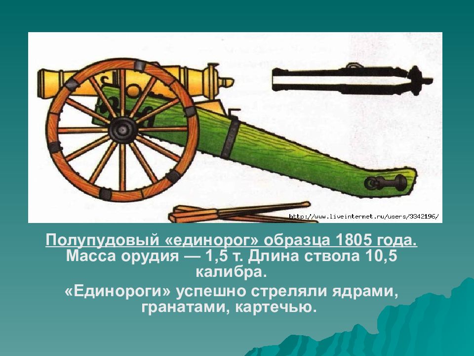 Полупудовый «единорог» образца 1805 года. Масса орудия — 1,5 т. Длина ствола 10,5 калибра. «Единороги» успешно стреляли ядрами, гранатами, картечью.