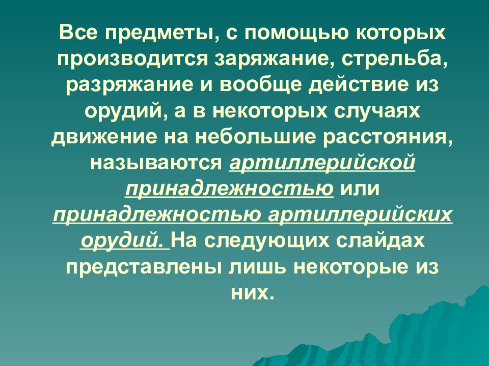 Слайд 13: Все предметы, с помощью которых производится заряжание, стрельба, разряжание и вообще действие из орудий, а в некоторых случаях движение на небольшие расстояния, называются артиллерийской принадлежностью или принадлежностью артиллерийских орудий. На следующих слайдах представлены лишь некоторые из них