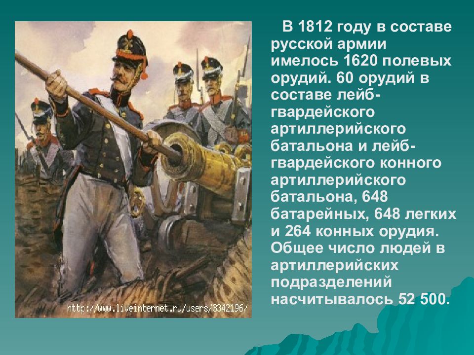 В 1812 году в составе русской армии имелось 1620 полевых орудий. 60 орудий в составе лейб-гвардейского артиллерийского батальона и лейб-гвардейского конного артиллерийского батальона, 648 батарейных, 648 легких и 264 конных орудия. Общее число людей в артиллерийских подразделений насчитывалось 52 500.