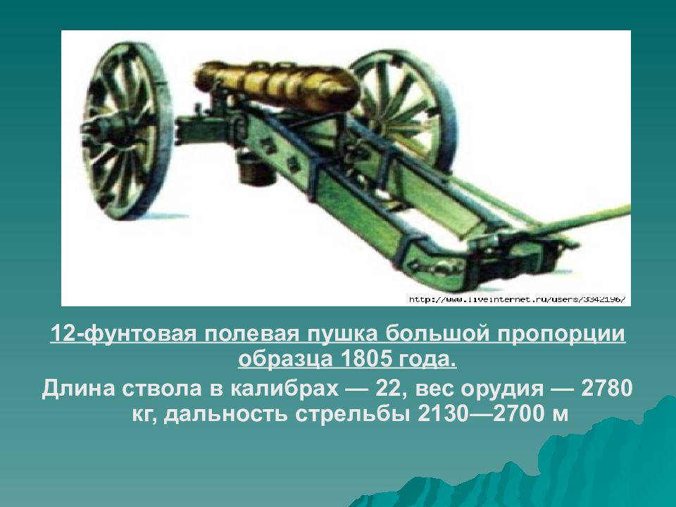 12-фунтовая полевая пушка большой пропорции образца 1805 года. Длина ствола в калибрах — 22, вес орудия — 2780 кг, дальность стрельбы 2130—2700 м