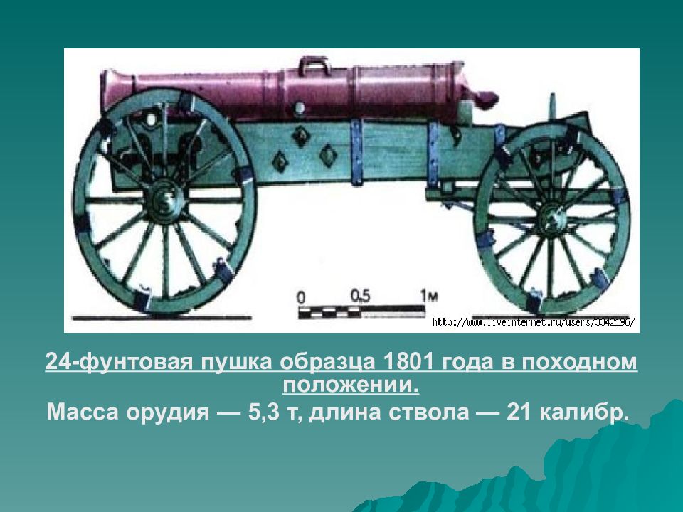 24-фунтовая пушка образца 1801 года в походном положении. Масса орудия — 5,3 т, длина ствола — 21 калибр.