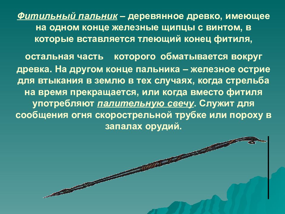 Слайд 15: Фитильный пальник – деревянное древко, имеющее на одном конце железные щипцы с винтом, в которые вставляется тлеющий конец фитиля, остальная часть которого обматывается вокруг древка. На другом конце пальника – железное острие для втыкания в землю в тех случаях, когда стрельба на время прекращается, или когда вместо фитиля употребляют палительную свечу. Служит для сообщения огня скорострельной трубке или пороху в запалах орудий