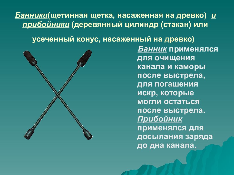 Слайд 14: Банники (щетинная щетка, насаженная на древко) и прибойники (деревянный цилиндр (стакан) или усеченный конус, насаженный на древко)