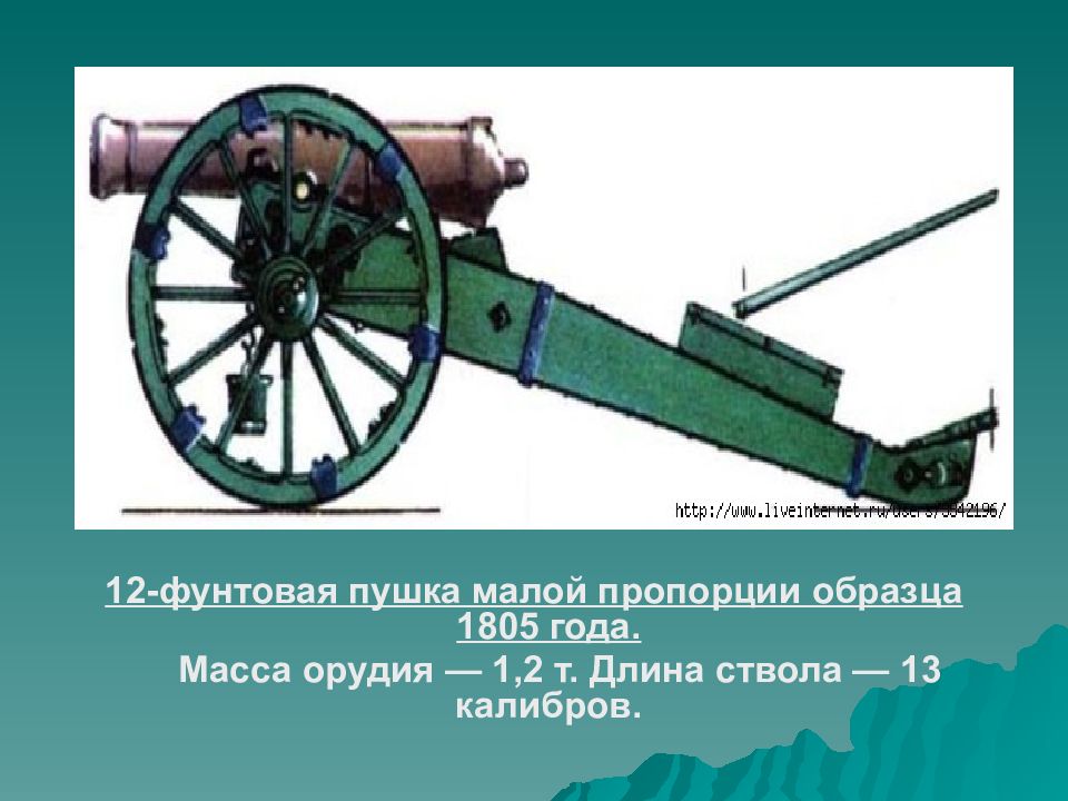 12-фунтовая пушка малой пропорции образца 1805 года. Масса орудия — 1,2 т. Длина ствола — 13 калибров.