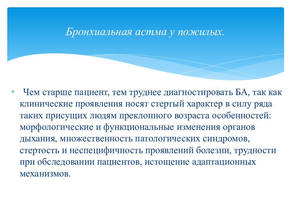 Чем старше пациент, тем труднее диагностировать БА, так как клинические проявления носят стертый характер в силу ряда таких присущих людям преклонного возраста особенностей: морфологические и функциональные изменения органов дыхания, множественность патологических синдромов, стертость и неспецифичность проявлений болезни, трудности при обследовании пациентов, истощение адаптационных механизмов. Бронхиальная астма у пожилых.
