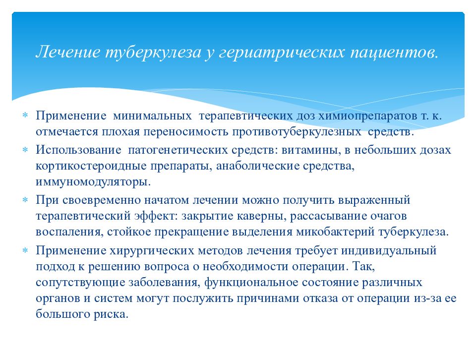 Применение минимальных терапевтических доз химиопрепаратов т. к. отмечается плохая переносимость противотуберкулезных средств. Использование патогенетических средств: витамины, в небольших дозах кортикостероидные препараты, анаболические средства, иммуномодуляторы. При своевременно начатом лечении можно получить выраженный терапевтический эффект: закрытие каверны, рассасывание очагов воспаления, стойкое прекращение выделения микобактерий туберкулеза. Применение хирургических методов лечения требует индивидуальный подход к решению вопроса о необходимости операции. Так, сопутствующие заболевания, функциональное состояние различных органов и систем могут послужить причинами отказа от операции из-за ее большого риска. Лечение туберкулеза у гериатрических пациентов.