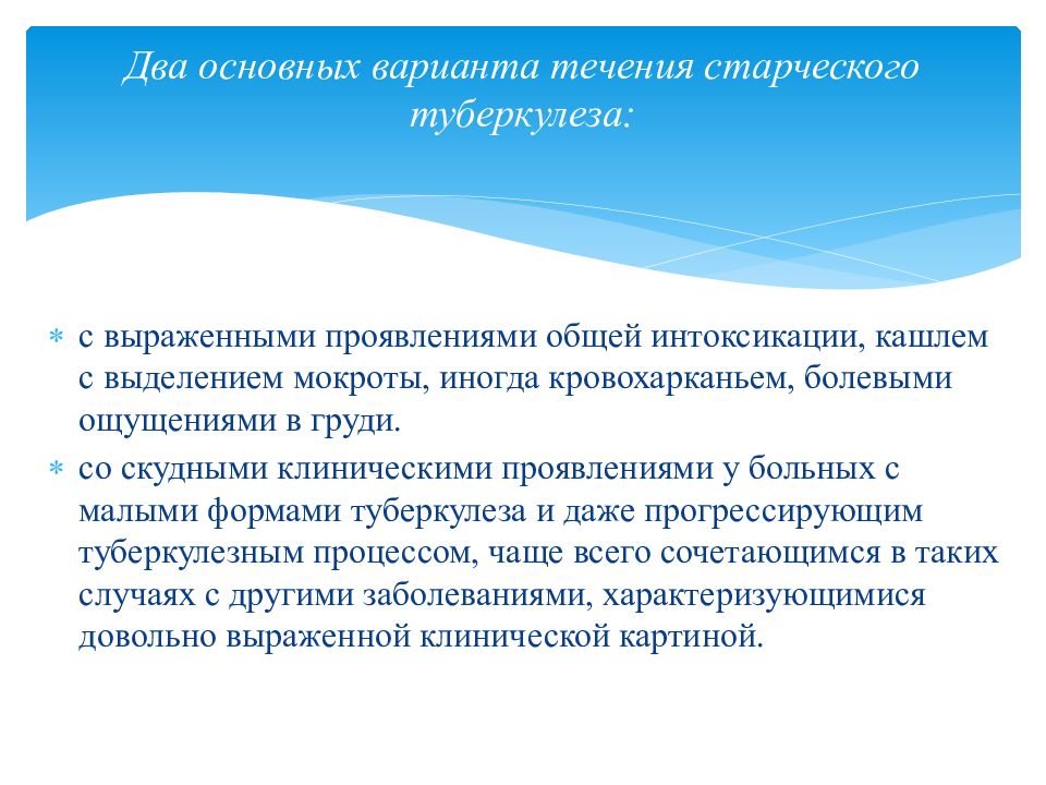 с выраженными проявлениями общей интоксикации, кашлем с выделением мокроты, иногда кровохарканьем, болевыми ощущениями в груди. со скудными клиническими проявлениями у больных с малыми формами туберкулеза и даже прогрессирующим туберкулезным процессом, чаще всего сочетающимся в таких случаях с другими заболеваниями, характеризующимися довольно выраженной клинической картиной. Два основных варианта течения старческого туберкулеза: