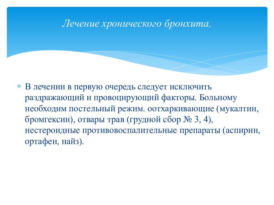 В лечении в первую очередь следует исключить раздражающий и провоцирующий факторы. Больному необходим постельный режим. оотхаркивающие ( мукалтин, бромгексин), отвары трав (грудной сбор № 3, 4), нестероидные противовоспалительные препараты (аспирин, ортафен, найз ). Лечение хронического бронхита.