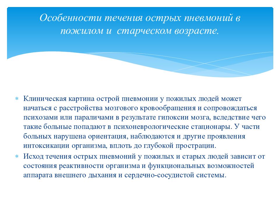 Клиническая картина острой пневмонии у пожилых людей может начаться с расстройства мозгового кровообращения и сопровождаться психозами или параличами в результате гипоксии мозга, вследствие чего такие больные попадают в психоневрологические стационары. У части больных нарушена ориентация, наблюдаются и другие проявления интоксикации организма, вплоть до глубокой прострации. Исход течения острых пневмоний у пожилых и старых людей зависит от состояния реактивности организма и функциональных возможностей аппарата внешнего дыхания и сердечно-сосудистой системы. Особенности течения острых пневмоний в пожилом и старческом возрасте.