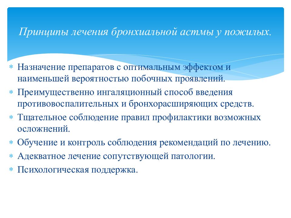 Назначение препаратов с оптимальным эффектом и наименьшей вероятностью побочных проявлений. Преимущественно ингаляционный способ введения противовоспалительных и бронхорасширяющих средств. Тщательное соблюдение правил профилактики возможных осложнений. Обучение и контроль соблюдения рекомендаций по лечению. Адекватное лечение сопутствующей патологии. Психологическая поддержка. Принципы лечения бронхиальной астмы у пожилых.