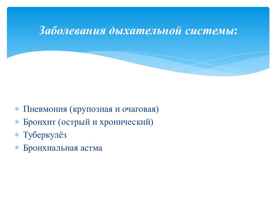 Пневмония (крупозная и очаговая) Бронхит (острый и хронический) Туберкулёз Бронхиальная астма Заболевания дыхательной системы :