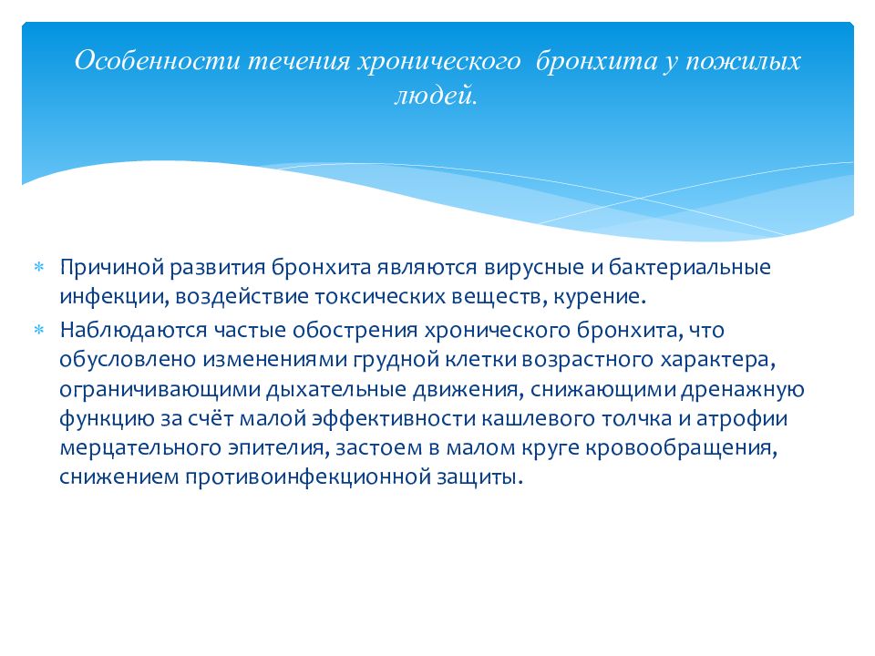 Причиной развития бронхита являются вирусные и бактериальные инфекции, воздействие токсических веществ, курение. Наблюдаются частые обострения хронического бронхита, что обусловлено изменениями грудной клетки возрастного характера, ограничивающими дыхательные движения, снижающими дренажную функцию за счёт малой эффективности кашлевого толчка и атрофии мерцательного эпителия, застоем в малом круге кровообращения, снижением противоинфекционной защиты. Особенности течения хронического бронхита у пожилых людей.