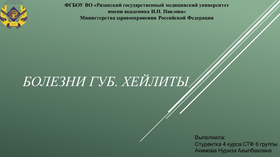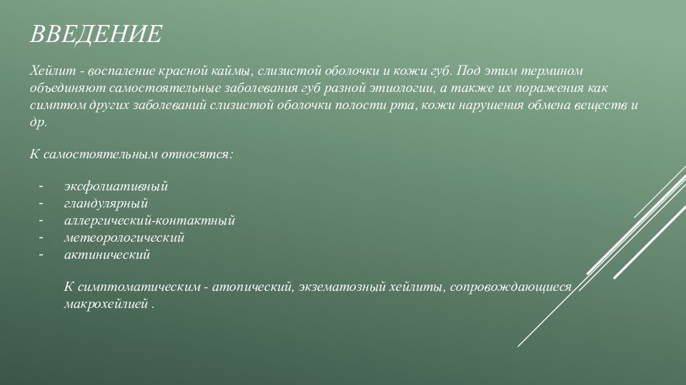 Хейлит - воспаление красной каймы, слизистой оболочки и кожи губ. Под этим термином объединяют самостоятельные заболевания губ разной этиологии, а также их поражения как симптом других заболеваний слизистой оболочки полости рта, кожи нарушения обмена веществ и др. К самостоятельным относятся: эксфолиативный гландулярный аллергический-контактный метеорологический актинический К симптоматическим - атопический, экзематозный хейлиты, сопровождающиеся макрохейлией.