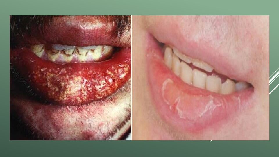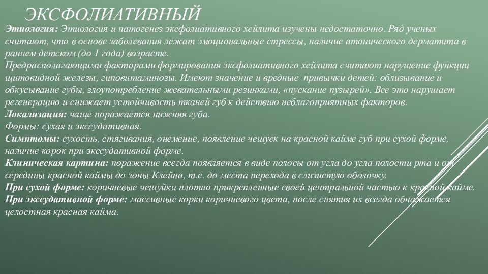 Этиология: Этиология и патогенез эксфолиативного хейлита изучены недостаточно. Ряд ученых считают, что в основе заболевания лежат эмоциональные стрессы, наличие атонического дерматита в раннем детском (до 1 года) возрасте. Предрасполагающими факторами формирования эксфолиативного хейлита считают нарушение функции щитовидной железы, гиповитаминозы. Имеют значение и вредные привычки детей: облизывание и обкусывание губы, злоупотребление жевательными резинками, «пускание пузырей». Все это нарушает регенерацию и снижает устойчивость тканей губ к действию неблагоприятных факторов. Локализация : чаще поражается нижняя губа. Формы : сухая и экссудативная. Симптомы: cухость, стягивания, онемение, появление чешуек на красной кайме губ при сухой форме, наличие корок при экссудативной форме. Клиническая картина: поражение всегда появляется в виде полосы от угла до угла полости рта и от середины красной каймы до зоны Клейна, т.е. до места перехода в слизистую оболочку. При сухой форме: коричневые чешуйки плотно прикрепленные своей центральной частью к красной кайме. При экссудативной форме: массивные корки коричневого цвета, после снятия их всегда обнажается целостная красная кайма.