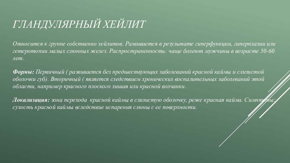 Относится к группе собственно хейлитов. Развивается в результате гиперфункции, гиперплазии или гетеротопии малых слюнных желез. Распространенность: чаще болеют мужчины в возрасте 50-60 лет. Формы: Первичный ( развивается без предшествующих заболеваний красной каймы и слизистой оболочки губ). Вторичный ( является следствием хронических воспалительных заболеваний этой области, например красного плоского лишая или красной волчанки. Локализация: зона перехода красной каймы в слизистую оболочку, реже красная кайма. Симптомы: сухость красной каймы вследствие испарения слюны с ее поверхности.