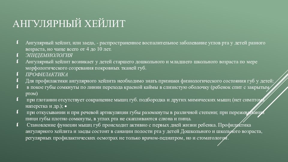 Ангулярный хейлит, или заеда, - распространенное воспалительное заболевание углов рта у детей разного возраста, но чаще всего от 4 до 10 лет. ЭПИДЕМИОЛОГИЯ Ангулярный хейлит возникает у детей старшего дошкольного и младшего школьного возраста по мере морфологического созревания покровных тканей губ. ПРОФИЛАКТИКА Для профилактики ангулярного хейлита необходимо знать признаки физиологического состояния губ у детей : в покое губы сомкнуты по линии перехода красной каймы в слизистую оболочку (ребенок спит с закрытым ртом) при глотании отсутствует сокращение мышц губ. подбородка и других мимических мышц (нет симптома наперстка и др.); при откусывании и при речевой артикуляции губы разомкнуты в различной степени; при пережевывании пищи губы плотно сомкнуты, в углах рта не скапливаются слюна и пища. Становление функции мышц губ происходит активно с первых дней жизни ребенка. Профилактика ангулярного хейлита и заеды состоит в санации полости рта у детей Дошкольного и школьного возраста, регулярных профилактических осмотрах не только врачом-педиатром, но и стоматологом.