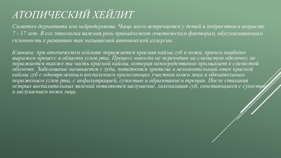 Симптом дерматита или нейродермита. Чаще всего встречается у детей и подростков в возрасте 7 - 17 лет. В его этиологии важная роль принадлежит генетическим факторам, обусловливающим склонность к развитию так называемой атопической аллергии. Клиника: при атопическом хейлите поражается красная кайма губ и кожа, причем наиболее выражен процесс в области углов рта. Процесс никогда не переходит на слизистую оболочку, не поражается также та часть красной каймы, которая непосредственно примыкает к слизистой оболочке. Заболевание начинается с зуда, появляются эритема и незначительный отек красной каймы губ с одновременным воспалением прилегающих участков кожи лица и обязательным поражением углов рта, с инфильтрацией, сухостью и образованием трещин. После стихания острых воспалительных явлений появляются шелушение, лихенизация губ, сочетающиеся с сухостью и шелушением кожи лица.
