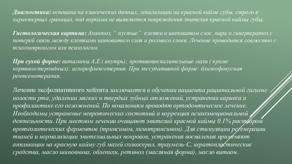 Диагностика: основана на клинических данных, локализации на красной кайме губы, строго в характерных границах, под корками не выявляется повреждения эпителия красной каймы губы. Гистологическая картина: Акантоз, “ пустые” клетки в шиповатом слое, пара и гиперкератоз с потерей связи между клетками шиповатого слоя и рогового слоев. Лечение проводится совместно с психоневрологом или психологом. При сухой форме: витамины А,Е ( внутрь); противовоспалительные мази ( кроме кортикостероидных); иглорефлексотерпия. При экссудативной форме: близкофокусная рентгенотерапия. Лечение эксфолиативного хейлита заключается в обучении пациента рациональной гигиене полости рта, удалении мягких и твердых зубных отложений, устранении кариеса и профилактике его осложнений. По показаниям проводят ортодонтическое лечение. Необходимы устранение невротических состояний и коррекция психоэмоциональной деятельности. При местном лечении очищают эпителий красной каймы 0.1% раствором протеолитических ферментов (трипсином, химотрипсином). Для стимуляции регенерации тканей и нормализации эпителиальных покровов, устранения воспаления применяют аппликации на красную кайму губ мазей солкосерил, траумель -С, кератопластические средства, масло шиповника, облепихи, ретинол (масляная форма), масло витаон.