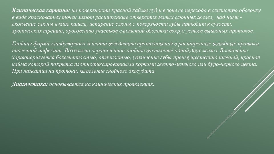 Клиническая картина: на поверхности красной каймы губ и в зоне ее перехода в слизистую оболочку в виде красноватых точек зияют расширенные отверстия малых слюнных желез, над ними - скопление слюны в виде капель, испарение слюны с поверхности губы приводит к сухости, хронических трещин, ороговению участков слизистой оболочки вокруг устьев выводных протоков. Гнойная форма гландулярного хейлита вследствие проникновения в расширенные выводные протоки пиогенной инфекции. Возможно ограниченное гнойное воспаление одной,двух желез. Воспаление характеризуется болезненностью, отечностью, увеличение губы преимущественно нижней, красная кайма которой покрыта плотнофиксированными корками желто-зеленого или буро-черного цвета. При нажатии на протоки, выделение гнойного экссудата. Диагностика: основывается на клинических проявлениях.