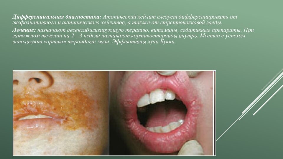 Дифференциальная диагностика: Атопический хейлит следует дифференцировать от эксфолиативного и актинического хейлитов, а также от стрептококковой заеды. Лечение: назначают десенсибилизирующую терапию, витамины, седативные препараты. При затяжном течении на 2—3 недели назначают кортикостероиды внутрь. Местно с успехом используют кортикостероидные мази. Эффективны лучи Букки.