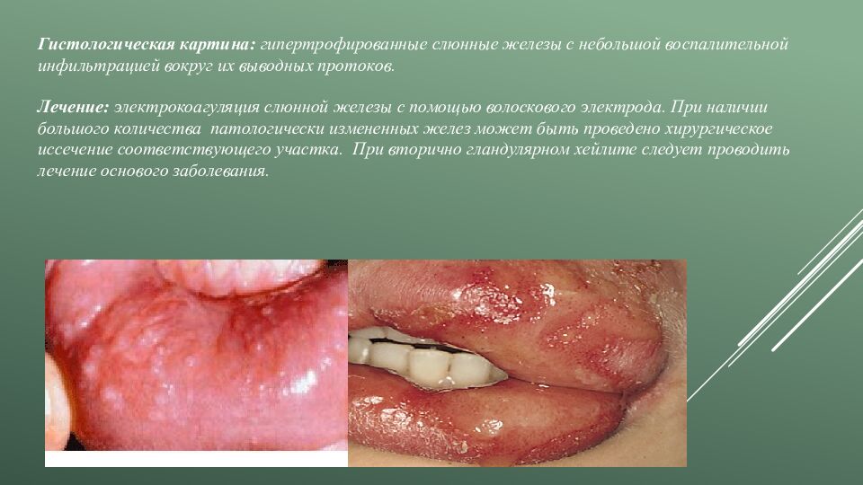 Гистологическая картина: гипертрофированные слюнные железы с небольшой воспалительной инфильтрацией вокруг их выводных протоков. Лечение: электрокоагуляция слюнной железы с помощью волоскового электрода. При наличии большого количества патологически измененных желез может быть проведено хирургическое иссечение соответствующего участка. При вторично гландулярном хейлите следует проводить лечение основого заболевания.