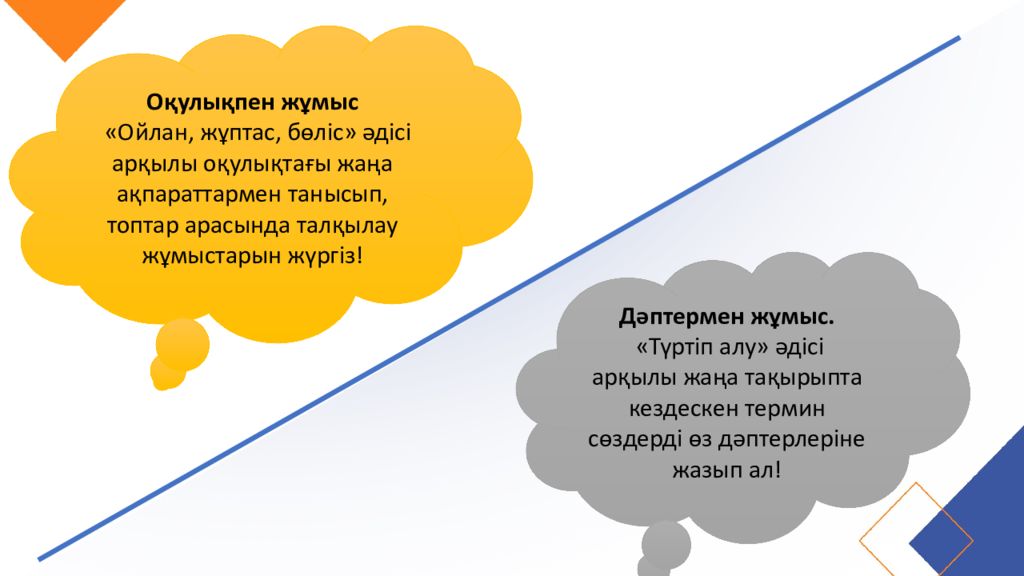 Оқулықпен жұмыс « Ойлан, жұптас, бөліс » әдісі арқылы оқулықтағы жаңа ақпараттармен танысып, топтар арасында талқылау жұмыстарын жүргіз ! Дәптермен жұмыс. « Түртіп алу » әдісі арқылы жаңа тақырыпта кездескен термин сөздерді өз дәптерлеріне жазып ал!
