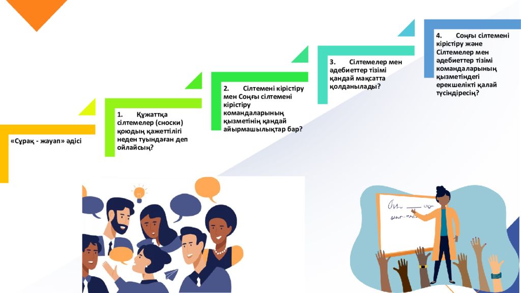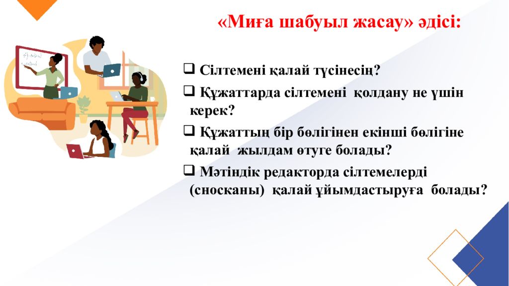 «Миға шабуыл жасау» әдісі: Сілтемені қалай түсінесің ? Құжаттарда сілтемені қолдану не үшін керек ? Құжаттың бір бөлігінен екінші бөлігіне қалай жылдам өтуге болады ? Мәтіндік редакторда сілтемелерді ( сносканы ) қалай ұйымдастыруға болады ?