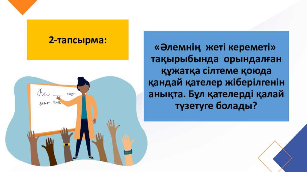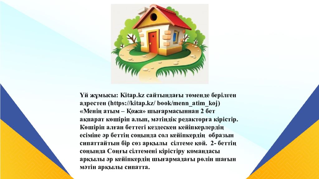 Үй жұмысы: Kitap.kz сайтындағы төменде берілген адрестен ( https://kitap.kz/ book/menn_atim_koj) « Менің атым – Қожа» шығармасыннан 2 бет ақпарат көшіріп алып, мәтіндік редакторға кірістір. Көшіріп алған беттегі кездескен кейіпкерлердің есіміне әр беттің соңында сол кейіпкердің образын сипаттайтын бір сөз арқылы сілтеме қой. 2- беттің соңында Соңғы сілтемені кірістіру командасы арқылы әр кейіпкердің шығармадағы рөлін шағын мәтін арқылы сипатта.
