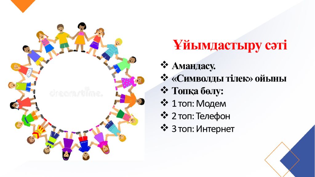 Ұйымдастыру сәті Амандасу. « Символды тілек » ойыны Топқа бөлу: 1 топ: Модем 2 топ: Телефон 3 топ: Интернет