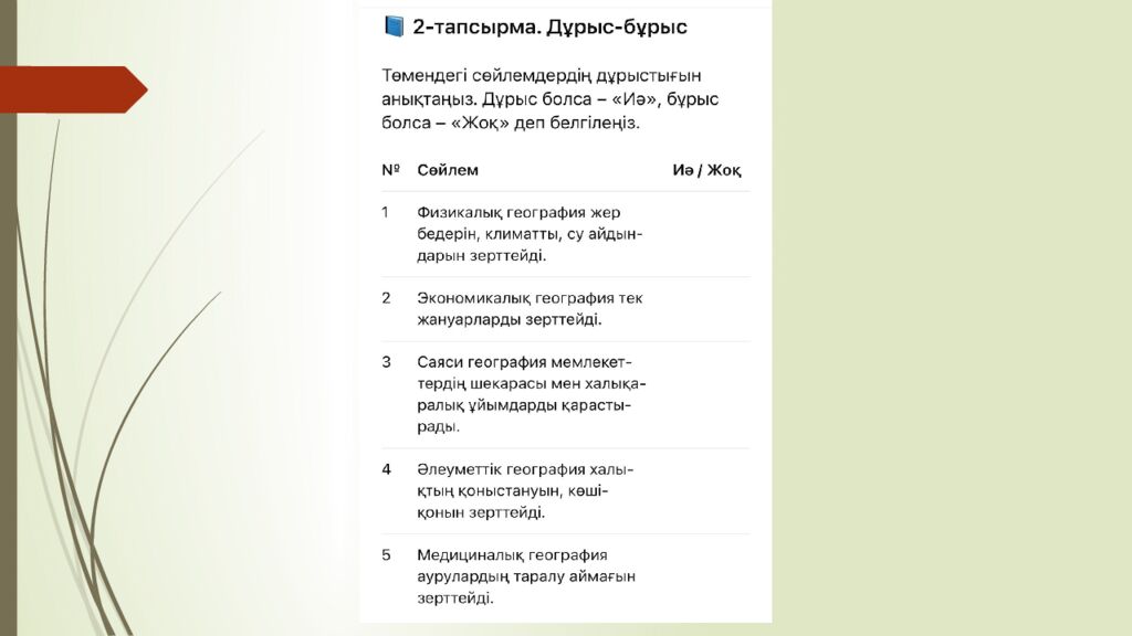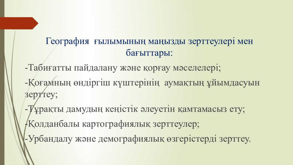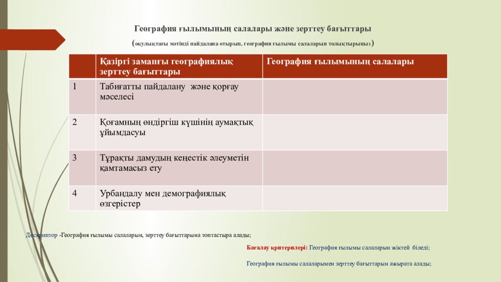 География ғылымының салалары және зерттеу бағыттары ( оқулықтағы мәтінді пайдалана отырып, география ғылымы салаларын толықтырыңыз ) Дескриптор -География ғылымы салаларын, зерттеу бағыттарына топтастыра алады; Бағалау критерилері: География ғылымы салаларын жіктей біледі; География ғылымы салаларымен зерттеу бағыттарын ажырата алады; Қазіргі заманғы географиялық зерттеу бағыттары География ғылымының салалары 1 Табиғатты пайдалану және қорғау мәселесі 2 Қоғамның өндіргіш күшінің аумақтық ұйымдасуы 3 Тұрақты дамудың кеңестік әлеуметін қамтамасыз ету 4 Урбандалу мен демографиялық өзгерістер