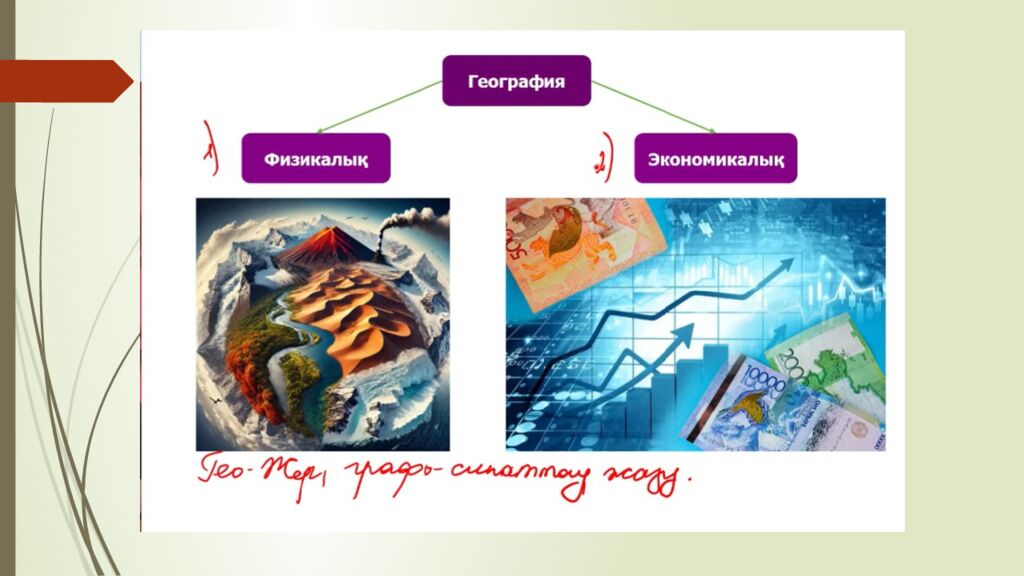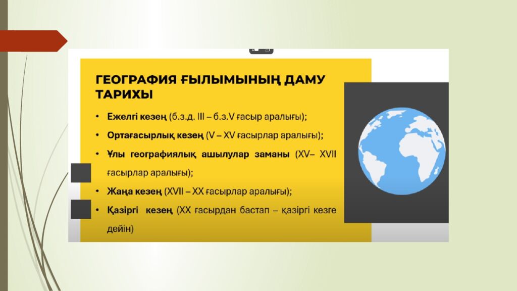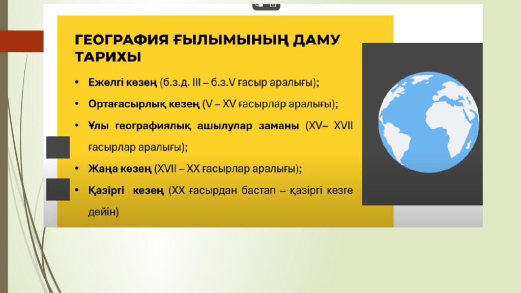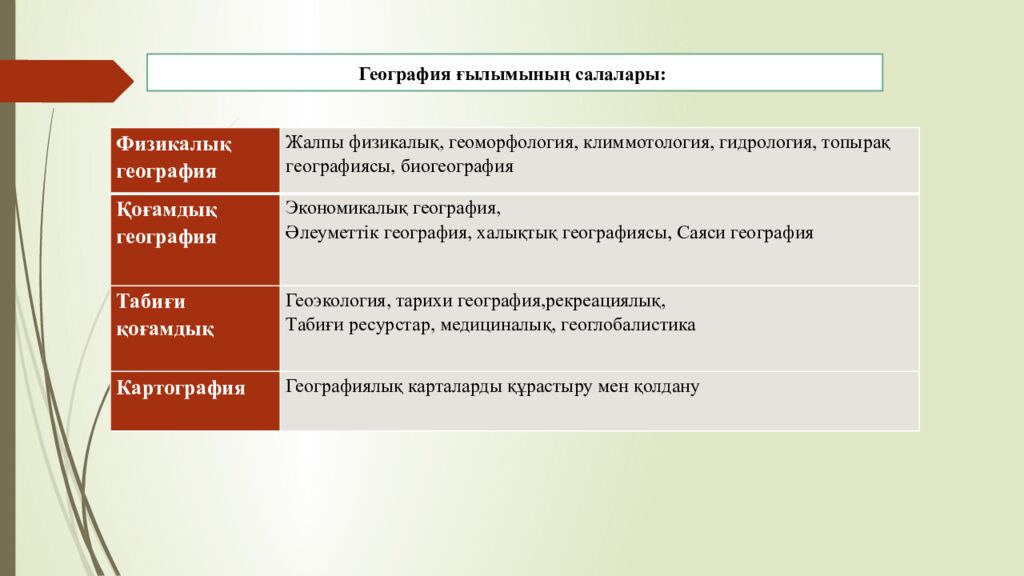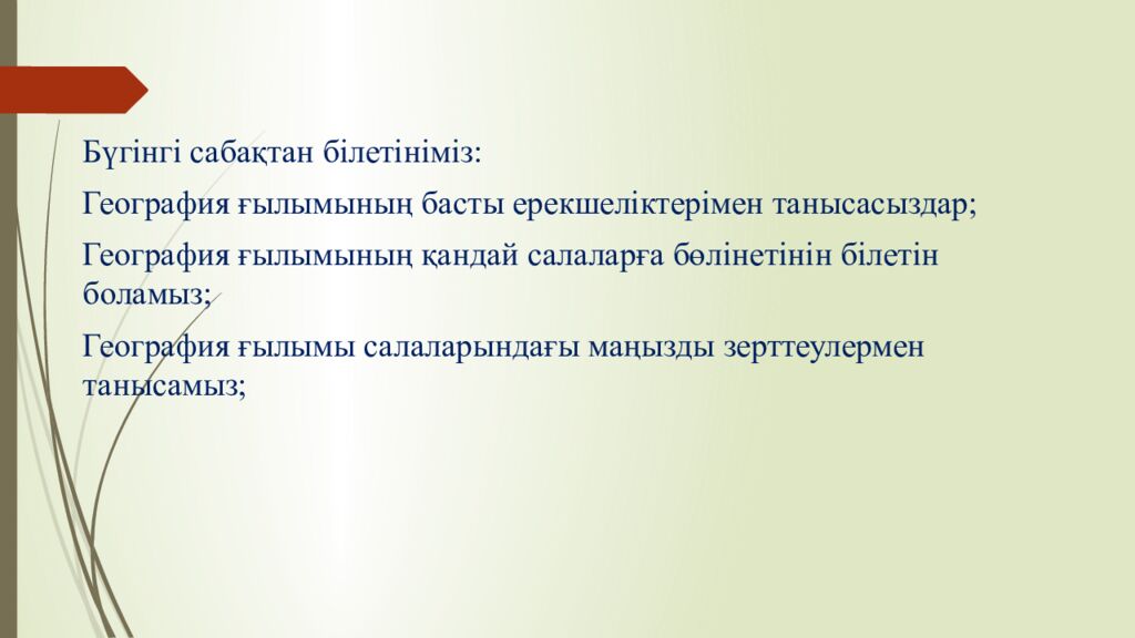 Бүгінгі сабақтан білетініміз: География ғылымының басты ерекшеліктерімен танысасыздар; География ғылымының қандай салаларға бөлінетінін білетін боламыз; География ғылымы салаларындағы маңызды зерттеулермен танысамыз;