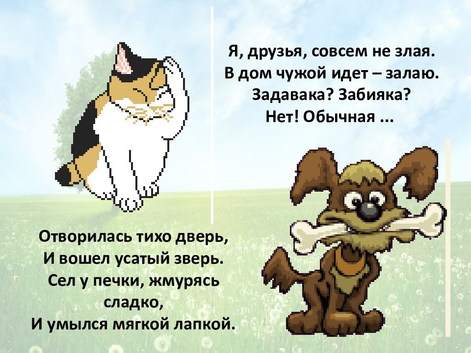 Отворилась тихо дверь, И вошел усатый зверь. Сел у печки, жмурясь сладко, И умылся мягкой лапкой. Я, друзья, совсем не злая. В дом чужой идет – залаю. Задавака? Забияка? Нет! Обычная...