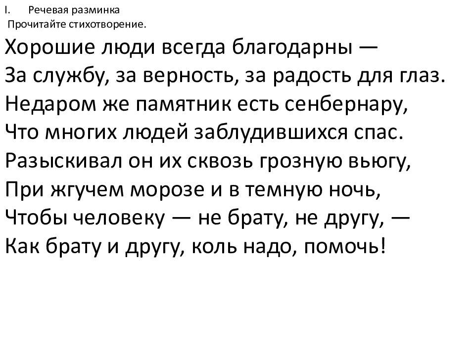 I. Речевая разминка Прочитайте стихотворение. Хорошие люди всегда благодарны — За службу, за верность, за радость для глаз. Недаром же памятник есть сенбернару, Что многих людей заблудившихся спас. Разыскивал он их сквозь грозную вьюгу, При жгучем морозе и в темную ночь, Чтобы человеку — не брату, не другу, — Как брату и другу, коль надо, помочь !