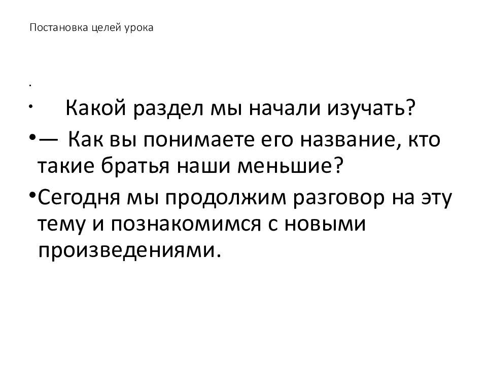 . Какой раздел мы начали изучать? — Как вы понимаете его название, кто такие братья наши меньшие? Сегодня мы продолжим разговор на эту тему и познакомимся с новыми произведениями.