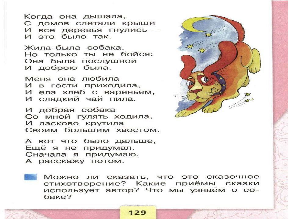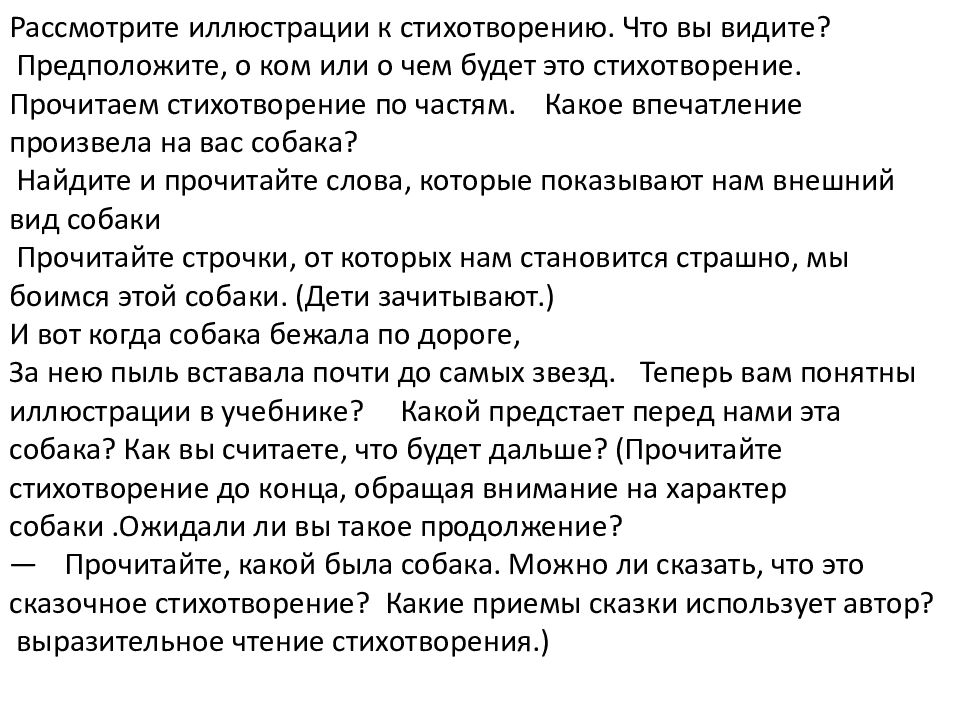 Рассмотрите иллюстрации к стихотворению. Что вы видите? Предположите, о ком или о чем будет это стихотворение. Прочитаем стихотворение по частям. Какое впечатление произвела на вас собака? Найдите и прочитайте слова, которые показывают нам внешний вид собаки Прочитайте строчки, от которых нам становится страшно, мы боимся этой собаки. (Дети зачитывают.) И вот когда собака бежала по дороге, За нею пыль вставала почти до самых звезд. Теперь вам понятны иллюстрации в учебнике? Какой предстает перед нами эта собака? Как вы считаете, что будет дальше? (Прочитайте стихотворение до конца, обращая внимание на характер собаки.Ожидали ли вы такое продолжение? — Прочитайте, какой была собака. Можно ли сказать, что это сказочное стихотворение? Какие приемы сказки использует автор? выразительное чтение стихотворения.)
