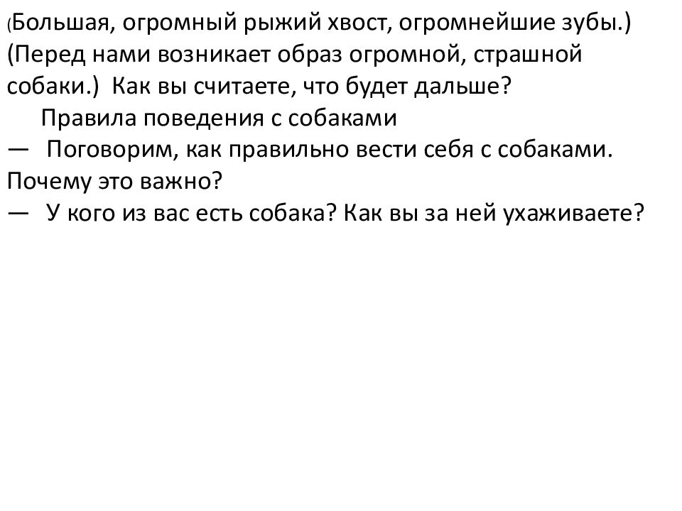 ( Большая, огромный рыжий хвост, огромнейшие зубы.) (Перед нами возникает образ огромной, страшной собаки.) Как вы считаете, что будет дальше? Правила поведения с собаками — Поговорим, как правильно вести себя с собаками. Почему это важно? — У кого из вас есть собака? Как вы за ней ухаживаете?