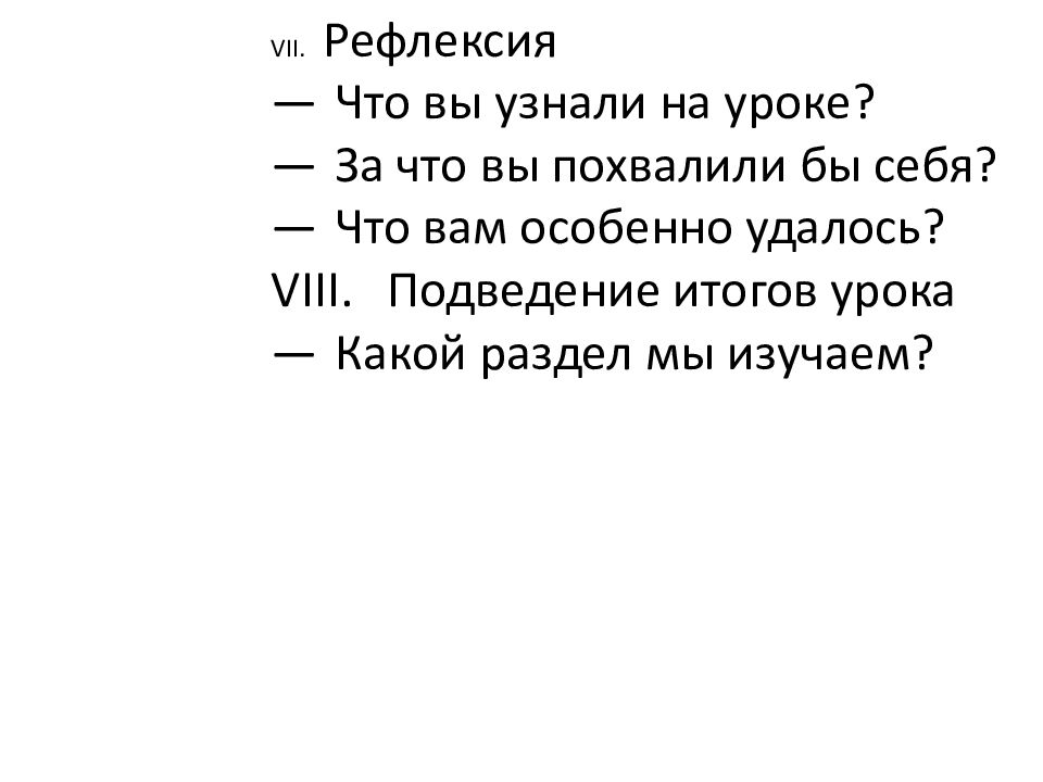 VII. Рефлексия — Что вы узнали на уроке? — За что вы похвалили бы себя? — Что вам особенно удалось? VIII. Подведение итогов урока — Какой раздел мы изучаем?