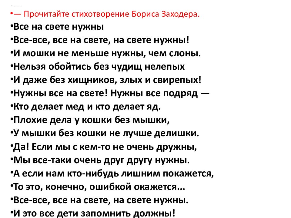 — Прочитайте стихотворение Бориса Заходера. Все на свете нужны Все-все, все на свете, на свете нужны! И мошки не меньше нужны, чем слоны. Нельзя обойтись без чудищ нелепых И даже без хищников, злых и свирепых! Нужны все на свете! Нужны все подряд — Кто делает мед и кто делает яд. Плохие дела у кошки без мышки, У мышки без кошки не лучше делишки. Да! Если мы с кем-то не очень дружны, Мы все-таки очень друг другу нужны. А если нам кто-нибудь лишним покажется, То это, конечно, ошибкой окажется... Все-все, все на свете, на свете нужны. И это все дети запомнить должны!