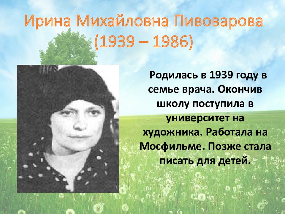 Родилась в 1939 году в семье врача. Окончив школу поступила в университет на художника. Работала на Мосфильме. Позже стала писать для детей. Ирина Михайловна Пивоварова (1939 – 1986)