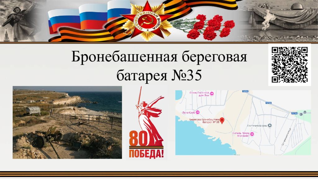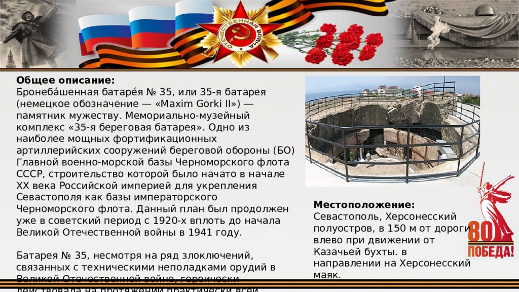 Общее описание: Бронеба́шенная батаре́я № 35, или 35-я батарея (немецкое обозначение — « Maxim Gorki II») ― памятник мужеству. Мемориально-музейный комплекс «35-я береговая батарея ». Одно из наиболее мощных фортификационных артиллерийских сооружений береговой обороны (БО) Главной военно-морской базы Черноморского флота СССР, строительство которой было начато в начале XX века Российской империей для укрепления Севастополя как базы императорского Черноморского флота. Данный план был продолжен уже в советский период с 1920-х вплоть до начала Великой Отечественной войны в 1941 году. Батарея № 35, несмотря на ряд злоключений, связанных с техническими неполадками орудий в Великой Отечественной войне, героически действовала на протяжении практически всей обороны Севастополя 1941—1942 годов. Местоположение: Севастополь, Херсонесский полуостров, в 150 м от дороги влево при движении от Казачьей бухты. в направлении на Херсонесский маяк.