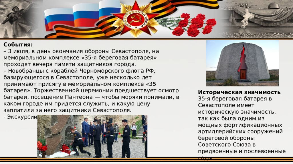 События: – 3 июля, в день окончания обороны Севастополя, на мемориальном комплексе «35-я береговая батарея» проходят вечера памяти защитников города. – Новобранцы с кораблей Черноморского флота РФ, базирующегося в Севастополе, уже несколько лет принимают присягу в мемориальном комплексе «35 батарея». Торжественной церемонии предшествует осмотр батареи, посещение Пантеона — чтобы моряки понимали, в каком городе им придется служить, и какую цену заплатили за него защитники Севастополя. - Экскурсии по музейному комплексу. Историческая значимость 35-я береговая батарея в Севастополе имеет историческую значимость, так как была одним из мощных фортификационных артиллерийских сооружений береговой обороны Советского Союза в предвоенные и послевоенные годы.