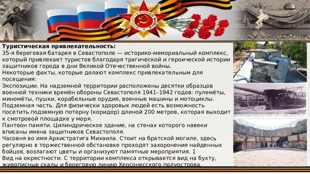 Туристическая привлекательность: 35-я береговая батарея в Севастополе — историко-мемориальный комплекс, который привлекает туристов благодаря трагической и героической истории защитников города в дни Великой Отечественной войны. Некоторые факты, которые делают комплекс привлекательным для посещения : Экспозиции. На надземной территории расположены десятки образцов военной техники времён обороны Севастополя 1941–1942 годов: пулемёты, миномёты, пушки, корабельные орудия, военные машины и мотоциклы. Подземная часть. Для физически здоровых людей есть возможность посетить подземную потерну (коридор) длиной 200 метров, которая выходит к смотровой площадке у моря. Пантеон памяти. Цилиндрическое здание, на стенах которого навеки вписаны имена защитников Севастополя. Часовня во имя Архистратига Михаила. Стоит на братской могиле, здесь регулярно в торжественной обстановке проходят захоронения найденных бойцов, возлагают цветы и организуют памятные мероприятия. 1 Вид на окрестности. С территории комплекса открывается вид на бухту, живописные скалы и береговую линию Херсонесского полуострова.