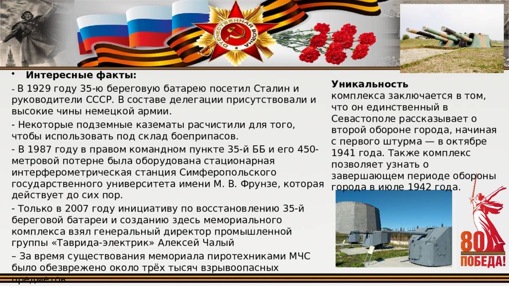 Интересные факты : - В 1929 году 35-ю береговую батарею посетил Сталин и руководители СССР. В составе делегации присутствовали и высокие чины немецкой армии. - Некоторые подземные казематы расчистили для того, чтобы использовать под склад боеприпасов. - В 1987 году в правом командном пункте 35-й ББ и его 450-метровой потерне была оборудована стационарная интерферометрическая станция Симферопольского государственного университета имени М. В. Фрунзе, которая действует до сих пор. - Только в 2007 году инициативу по восстановлению 35-й береговой батареи и созданию здесь мемориального комплекса взял генеральный директор промышленной группы «Таврида-электрик» Алексей Чалый – За время существования мемориала пиротехниками МЧС было обезврежено около трёх тысяч взрывоопасных предметов. Уникальность комплекса заключается в том, что он единственный в Севастополе рассказывает о второй обороне города, начиная с первого штурма — в октябре 1941 года. Также комплекс позволяет узнать о завершающем периоде обороны города в июле 1942 года.