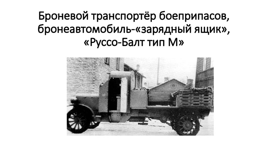 Слайд 3: Броневой транспортёр боеприпасов, бронеавтомобиль-«зарядный ящик», «Руссо- Балт тип М»