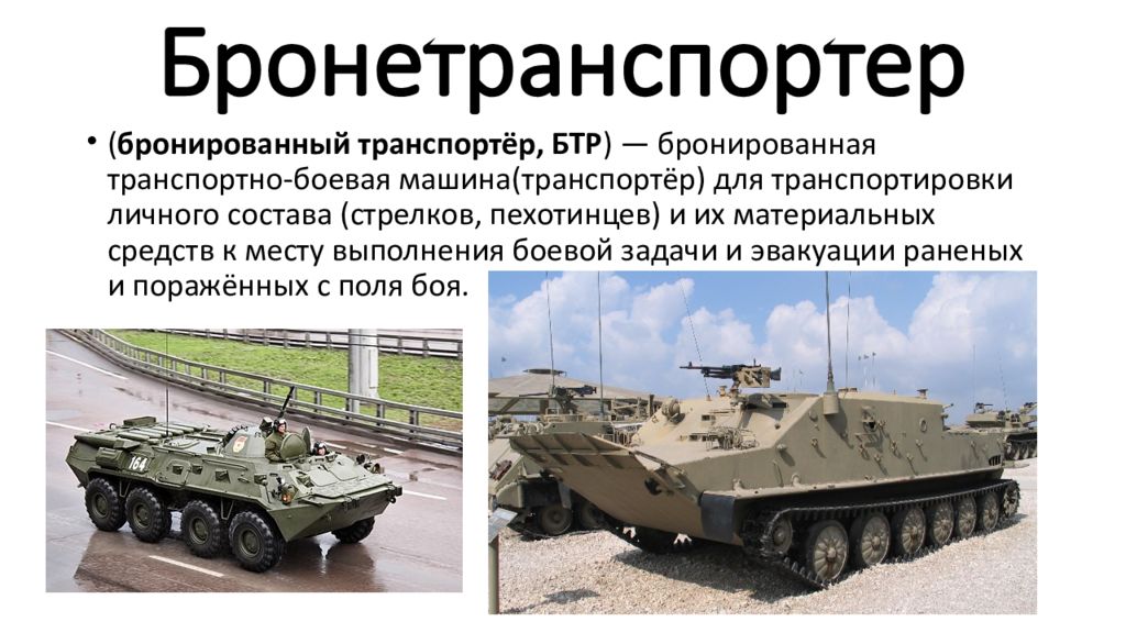 ( бронированный транспортёр, БТР ) — бронированная транспортно-боевая машина(транспортёр) для транспортировки личного состава (стрелков, пехотинцев) и их материальных средств к месту выполнения боевой задачи и эвакуации раненых и поражённых с поля боя.